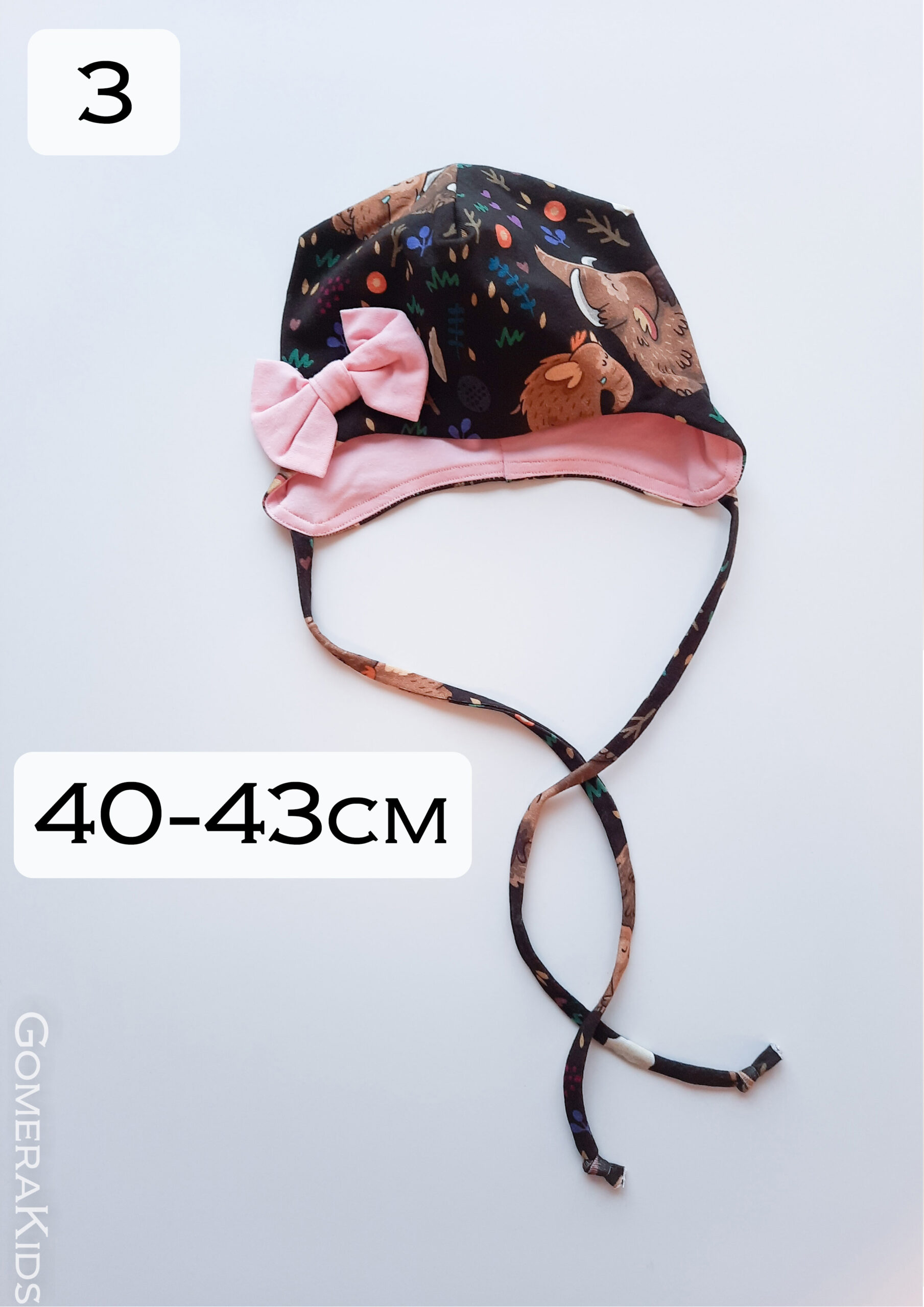Mugav ja vahva puuvillatrikotaažist müts, mille põhikangaks on pruunikal toonil mammutitega muster. Vooder ja lips on heleroosad. Müts sobib kandmiseks kevadel ja sügisel.